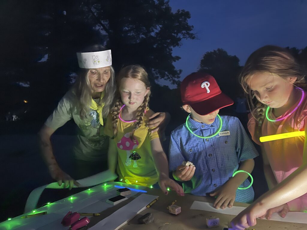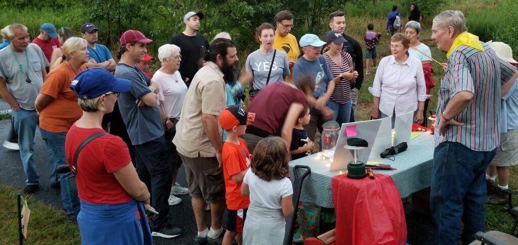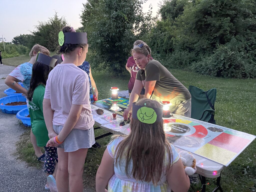 The festival includes a number of fun, family-friendly, education stations scattered along a half-mile mile, self-guided trail. We recommend people arrive between 8:00 and 8:15 pm and allow an hour to complete the walk.  Some species appear at dusk; some appear when it is darker (the best viewing is after 9:00). The spectacular tree-top species is high in the trees near “the fishing ponds”.