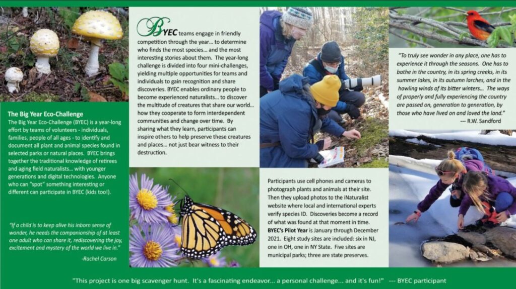 The Big Year Eco-Challenge (BYEC) is a year-long effort by teams of volunteers – individuals, families, people of all ages – to identify and document all plant and animal species found in selected parks or natural places. BYEC brings together the traditional knowledge of retirees and aging field naturalists… with younger generations and digital technologies. Anyone who can “spot” something interesting or different can participate in BYEC (kids too!).